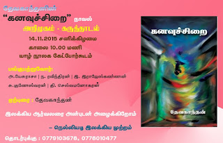 எழுத்தாளர் தேவகாந்தனின் கனவுச்சிறை நாவல் தொடர்பான அறிமுகமும் கருத்தாடலும் 14.11.2015 சனிக்கிழமை காலை 10.30 மணிக்கு யாழ்ப்பாணம் பொதுநூலக கேட்போர் கூடத்தில் அ.யேசுராசா தலைமையில் இடம்பெற்றது. நிகழ்வில் நாவல் பற்றிய கருத்துரைகளை ந. ரவீந்திரன், இ. இராஜேஸ்கண்ணன், சு. குணேஸ்வரன், தி.செல்வமனோகரன் ஆகியோர் நிகழ்த்தினர். ஏற்புரையை தேவகாந்தன் நிகழ்த்தினார். நெல்லியடி இலக்கிய முற்றத்தின் ஏற்பாட்டில் யாழ் பொதுசன நூலக வாசகர் வட்டத்தின் அனுசரணையில் இடம்பெற்ற மேற்படி நிகழ்வில் நன்றியுரையை கிரிஷாந் நிகழ்த்தினார்.